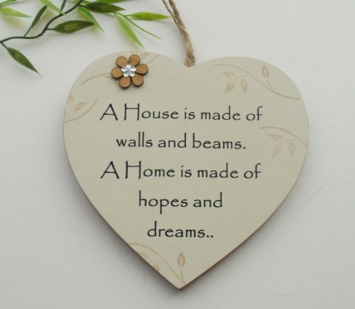 Insegna regalo per la casa a forma di cuore, con scritta in inglese "A house is built of walls and beams"