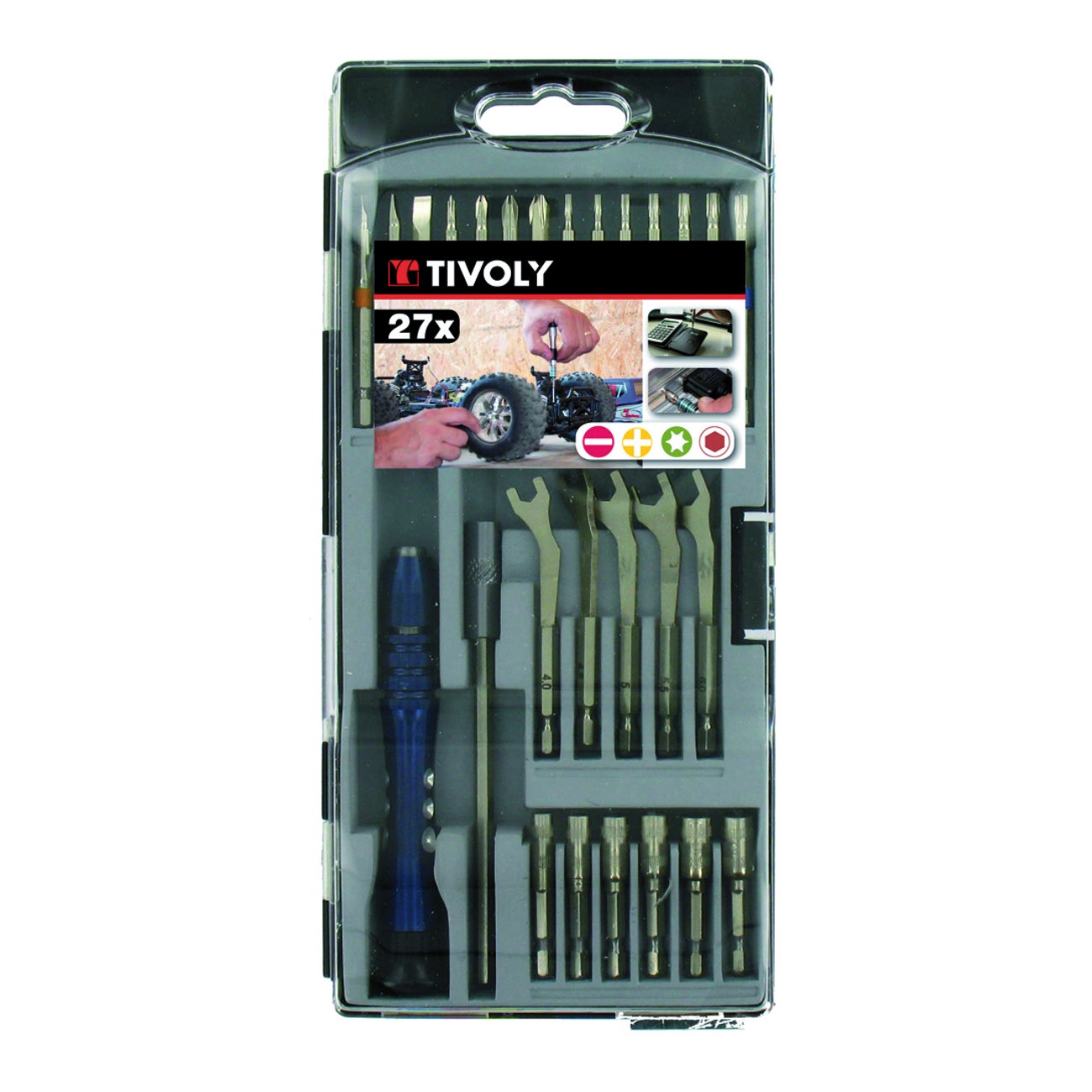 Composto da: 8 T da 20 25 27 30 40 8 10 15, 3 tri-wing da 1 2 3, 3 torq-set da 6 8 10, portainserto e valigetta