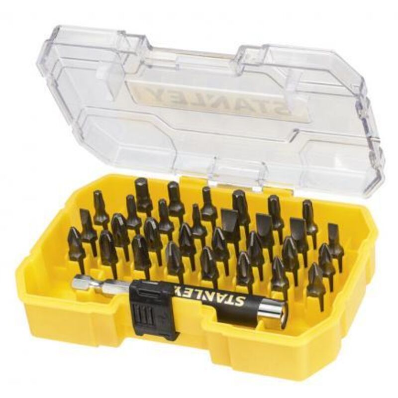 Inserti Set da 31 pz con porta inserti Stanley 7228XJ Il Set per Avvitare Stanley da 31 pezzi con porta inserti 7228XJ è la soluzione completa per tutte le tue esigenze di avvitatura. Questo kit versatile offre una vasta gamma di inserti di alta qualità, garantendo che tu abbia sempre l'accessorio giusto per il lavoro. Affronta con fiducia qualsiasi progetto di avvitatura con questo set robusto e ben progettato. Caratteristiche Principali: Inserti Misti di Alta Qualità: Il set include 30 inserti misti da 25mm, progettati per coprire una varietà di tipi di viti e bulloni. Le tipologie di inserti comprendono PH1, PH2, PZ2, PZ3, SL4, SL6, SL7, T10, T15, T20, T25, T30, H3, H4, H5, garantendo la compatibilità con una vasta gamma di applicazioni. Adattatore Magnetico con Guida: L'adattatore magnetico con guida è un componente chiave del set. Questo accessorio assicura una presa salda e sicura degli inserti durante l'avvitatura, riducendo il rischio di cadute accidentali delle viti e