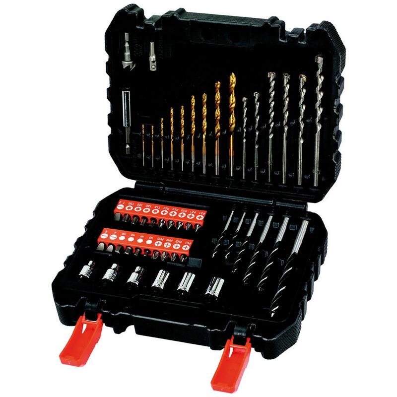 In valigetta plastica. composizione: 20 inserti da 25 mm (pz-ph-tx-sl), 6 bussole (da 4 a 10 mm), 9 punte metallo (da 1,5 a 6 mm), 6 punte muro (da 4 a 10 mm), 5 punte legno (da 3 a 8 mm). con 1 adattatore megnetico, 1 adattatore per chiavi a bussola, 1 p
