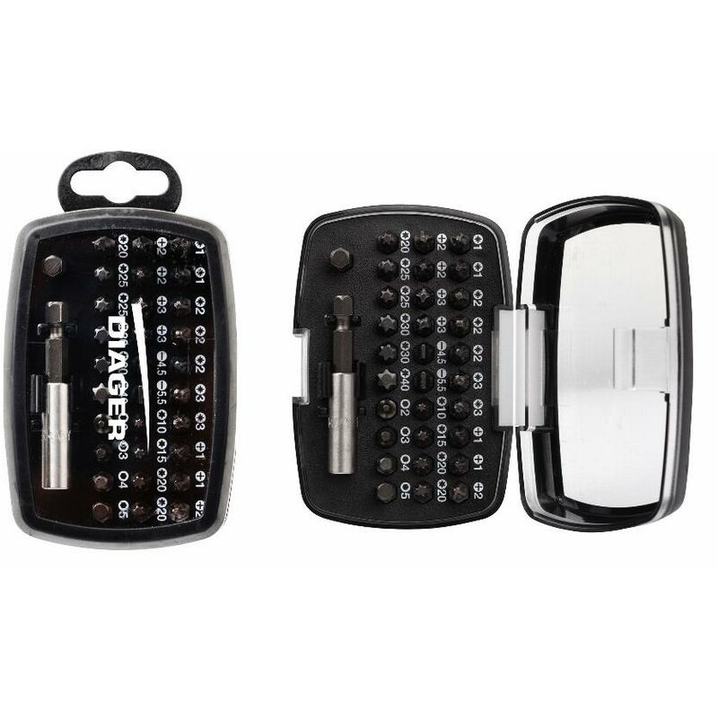 Dettagli: Geometria di torsione. Durezza standard DIN. Protezione dalla ruggine. Elevata resistenza alla coppia grazie alla geometria a torsione. Indentazione precisa per la compatibilità con tutte le viti. Protezione dalla ruggine. 25 mm: PZ1(x2)-2(x3)-3(x2) PH1(x2)-2(x3)-3(x2) PL4,5-5,5 TX10-15-20(x3)-25(x2)-30(x2)-40 HEX2-3-4-5-6 + 1 porta bit STD