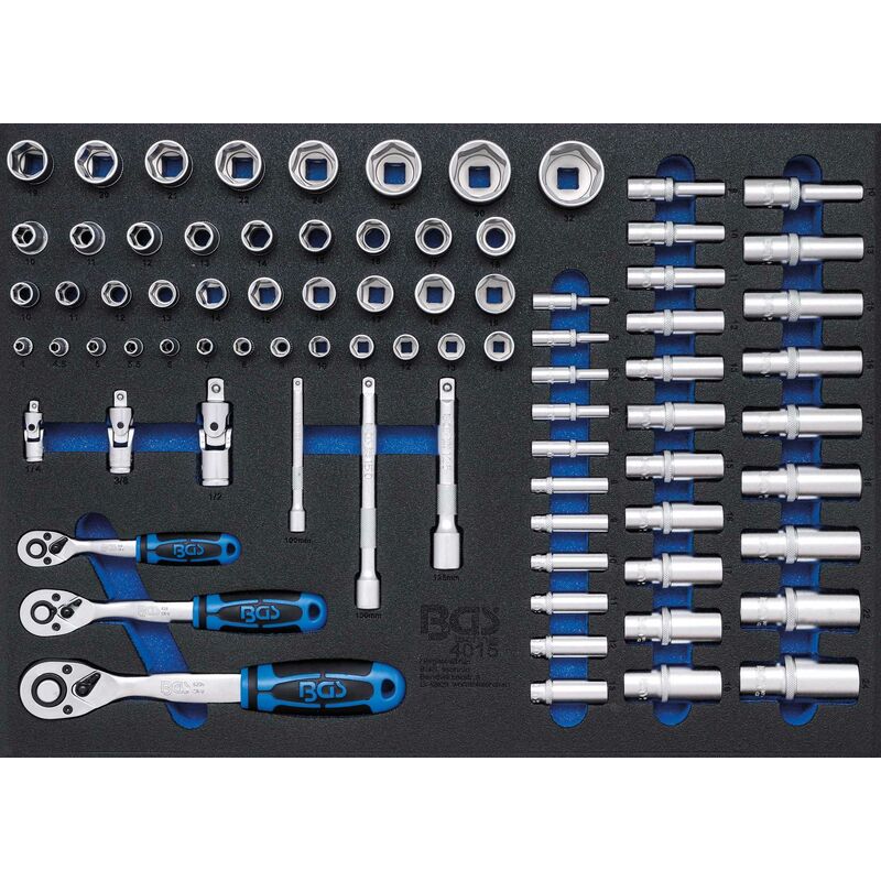 Cricchetti reversibili, dentatura fine, 72 denti con bussola ad innesto rapido, impugnature ergonomiche bicomponente antiscivolo, con attacco esagonale esterno: 6,3 mm (1/4'') - 10 mm (3/8'') - 12,5 mm (1 /2'') Bussole per chiave, Pro Torque, quadro 6,3 mm (1/4''): 4 - 4,5 - 5 - 5,5 - 6 - 7 - 8 - 9 - 10 - 11 - 12 - 13 - 14 mm Bussole per chiave, Pro Torque, quadro 10 mm (3/8''): 10 - 11 - 12 - 13 - 14 - 15 - 16 - 17 - 18 - 19 mm Chiavi a bussola, Pro Torque, quadro 12,5 mm (1/2''): 10 - 11 - 12 - 13 - 14 - 15 - 16 - 17 - 18 - 19 - 20 - 21 - 22 - 24 - 27 - 30 - 32mm Chiavi a bussola, profonde, Pro Torque, quadro 6,3 mm (1/4''): 4 - 5 - 5,5 - 6 - 7 - 8 - 9 - 10 - 11 - 12 - 13 mm Chiavi a bussola, profonde, Pro Torque, quadro 10 mm (3/8''): 8 - 10 - 11 - 12 - 13 - 14 - 15 - 16 - 17 - 18 - 19 mm Chiavi a bussola, profonde, Pro Torque, quadro 12,5 mm (1/2''): 10 - 13 - 15 - 16 - 17 - 18 - 19 - 22 - 24 mm Prolunga quadrata maschio/femmina quadrata 6,3 mm, lunghezza 75 mm Prolunga quadrata
