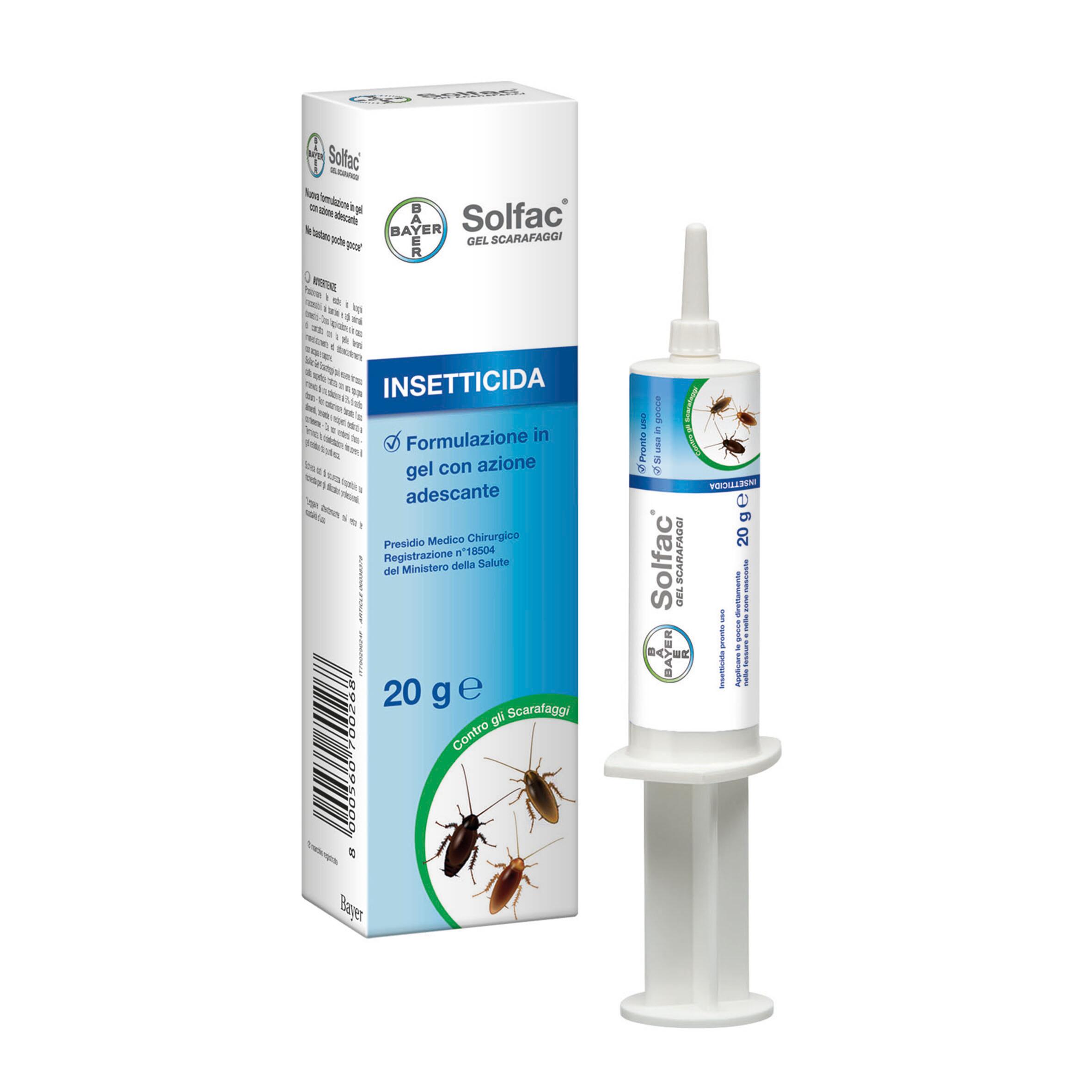 Solfac gel scarafaggi è un gel altamente attrattivo che si applica in gocce vicino ai possibili nascondigli degli scarafaggi. Durante il trattamento è possibile soggiornare nei locali da disinfestare.. E' attrattivo e appetibile per tutti i tipi di scarafaggi, che nutrendosene scompaiono.. Facile e sicuro da usare, non ha odore nè colore e non cola se applicato su superfici verticali.. Formulazione in gel con effetto adescante. Invisibile in qualsiasi posizione, si può applicare direttamente nelle fessure dei muri o del pavimento. Applicabile anche in locali abitati