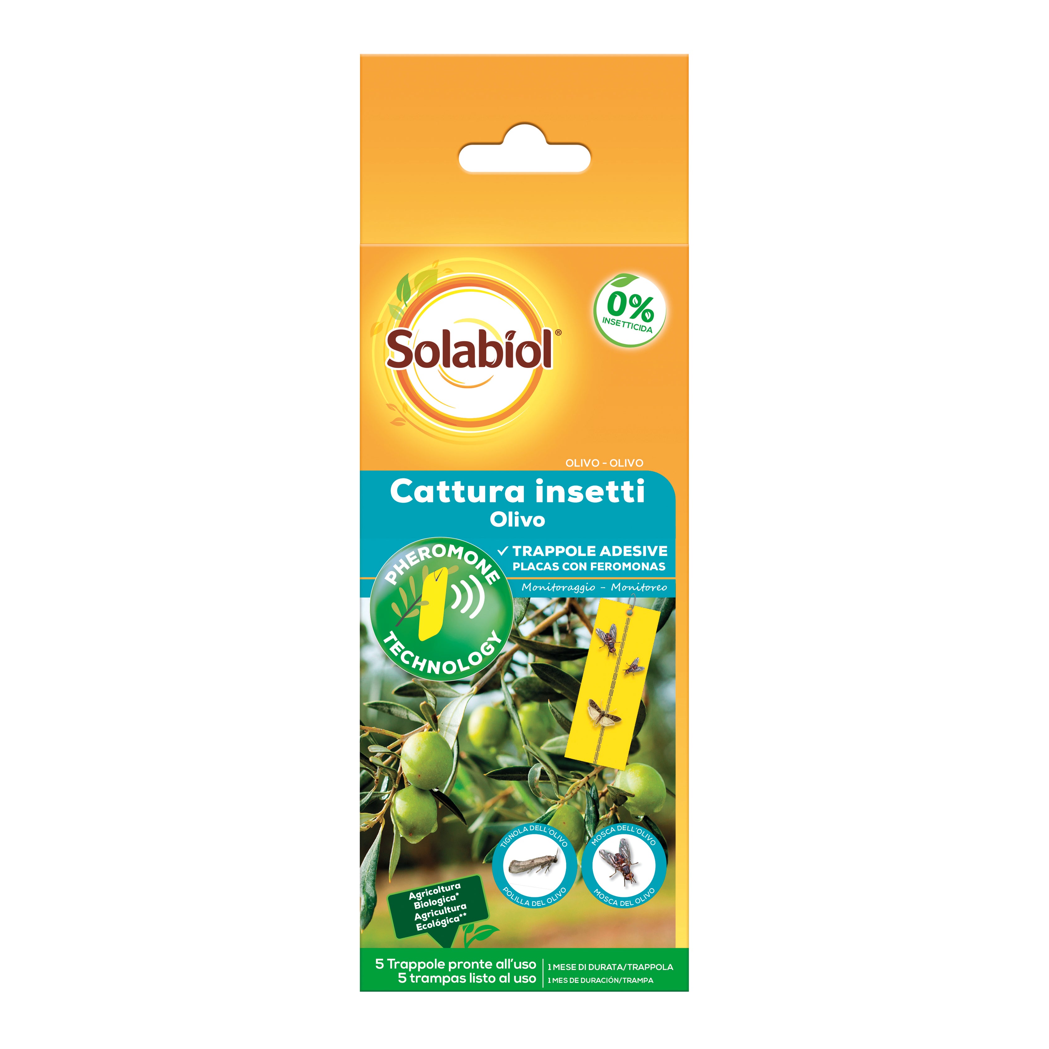 Trappola cattura insetti pronta all'uso con fermone specifico di attrazione per la cattura ed il controllo della Mosca dell'olivo e della Tignola dell'olivo.. Efficaci e sicure. 0% Insetticida. Doppia azione contro gli insetti bersaglio grazie al colore giallo e al feromone d'attrazione specifico. Non si usano insetticidi. Una trappola dura un mese e resiste a vento, pioggia e intemperie