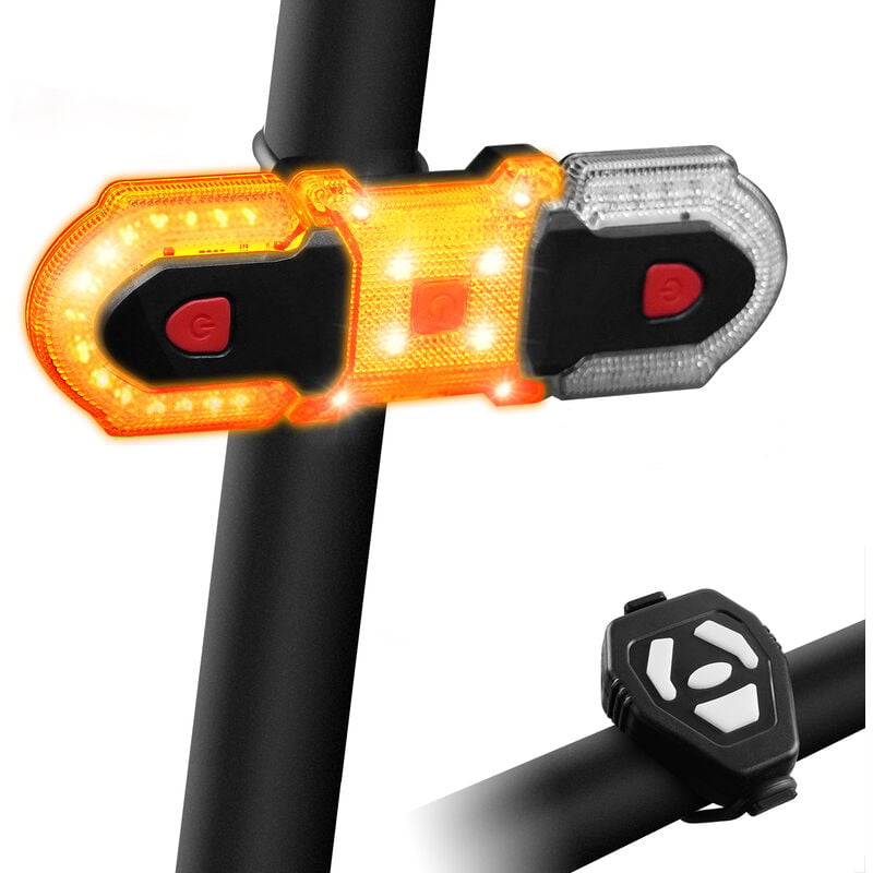 La luce per bicicletta multifunzionale con indicatori di direzione ti rende visibile da lontano e ricorda ai conducenti di mantenere la distanza di sicurezza quando la guida ti passa accanto. È il tuo miglior partner per il ciclismo notturno. Caratteristiche: Telecomando wireless installato sul manubrio per il controllo degli indicatori di direzione destra/sinistra e della luce principale. Diverse modalità di illuminazione commutabili premendo i pulsanti sul telecomando. Offre grande sicurezza durante il ciclismo notturno. La luce principale da 500 mAh e due indicatori di direzione da 300 mAh possono essere ricaricati da qualsiasi dispositivo con una porta USB. L'alimentazione del telecomando tramite batteria a bottone CR2032 (inclusa). Resistenza all'acqua IPX6, la luce può essere utilizzata nei giorni di pioggia, neve o nebbia fitta. (NOTA: non immergere in acqua per molto tempo). Design diviso per luci mian e indicatori di direzione, soddisfa le tue diverse esigenze. Nessun