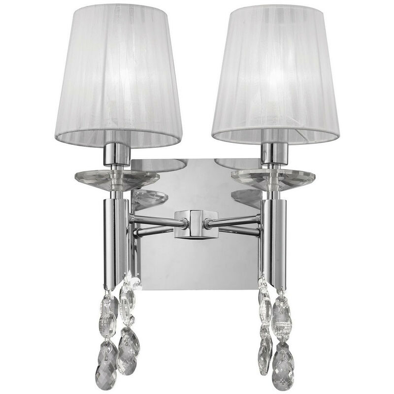 Applique Tiffany 2+2 Luci E14 Con Paralumi Bianchi Cromo Lucido/Cristallo | Finitura: cromo lucido | Materiale: cristallo trasparente K9 | Classificazione IP: IP20 | Altezza: 45cm | Larghezza: 33 cm | Proiezione: 19 cm | Tipo di lampada: E14 | N. di lampade: 2 | Lampadina inclusa: No | Dimmerabile: Sì - Lampade dimmerabili richieste | Peso: 1,7 kg | Potenza (massima): 15 W | Commutato: Non commutato