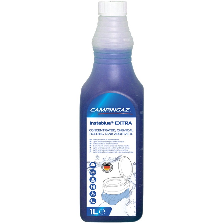 L''additivo sanitario Instablue Extra 1L di Campingaz è un concentrato sanitario liquido biodegradabile (densità 1 g/ml) per WC chimici. L''additivo inibisce la formazione di odori e decompone le feci. Il flacone con tappo di sicurezza per bambini è dotato di una pratica bilancia dosatrice.