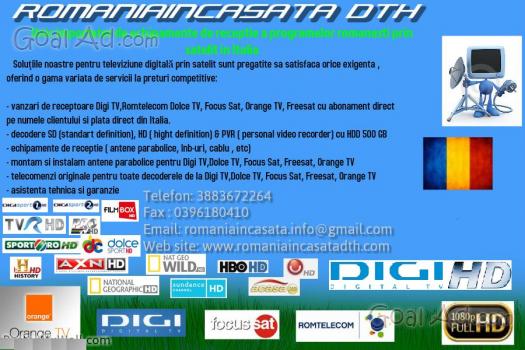 Vanzari si instalare de echipamente pentru receptionarea de programe romanesti in toata Italia cu abonament pe numele clientului(Dolce tv FOCUS SAT MILANO,DOLCE TV MILANO,DIGI TV TV MILANO).Echipamentul include decoderul,cartela si antena parabolica. Reglare,instalare,schimbare locatie la toate tipurile de antene satelit (Digi, Dolce, Focussat, Akta, Boom) Contactati-ne prin telefon sau e-mail si va oferim suportul in cel mai scurt timp. Expediem echipamente de receptie(decoder,cartela,antena parabolica) a programelor romanesti pe tot teritoriul Italiei inclus insulele(Sicilia&Sardegna).Expeditia se face prin intermediul Postei italiene cu plata la primirea coletului