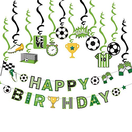 Pacchetto:Ll pacchetto di decorazioni per feste di compleanno di tifosi di calcio per ragazzi include: ghirlanda di striscioni di buon compleanno di calcio, 12 pezzi di decorazione a spirale da appendere a calcio (design di 12 turbinii di calcio) .Decorazioni di compleanno a tema di calcio divertenti e vivaci.