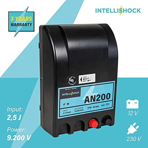 Intellishock AN200, Elettrificatore per recinti combi, 12V/230V, Indicatore della batteria, circuito di risparmio energetico, ideale per reti per pecore 10x50m, per recinti lunghi, perfetto per bovini