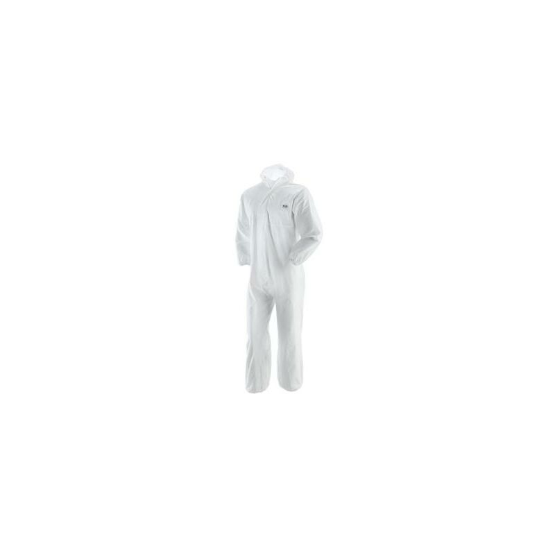 Tuta intera monouso con cappuccio in 52% polipropilene - 48% polietilene. Tessuto-non tessuto in polipropilene ricoperto da un film microporoso di polietilene. Materiale ipoallergenico. Peso tessuto 63 g/m2, cappuccio fisso con elastico senza lattice, elastico stringipolso, stringicaviglia, stringivita senza lattice, chiusura con cerniera e patta di 5 cm, superficie microporosa.