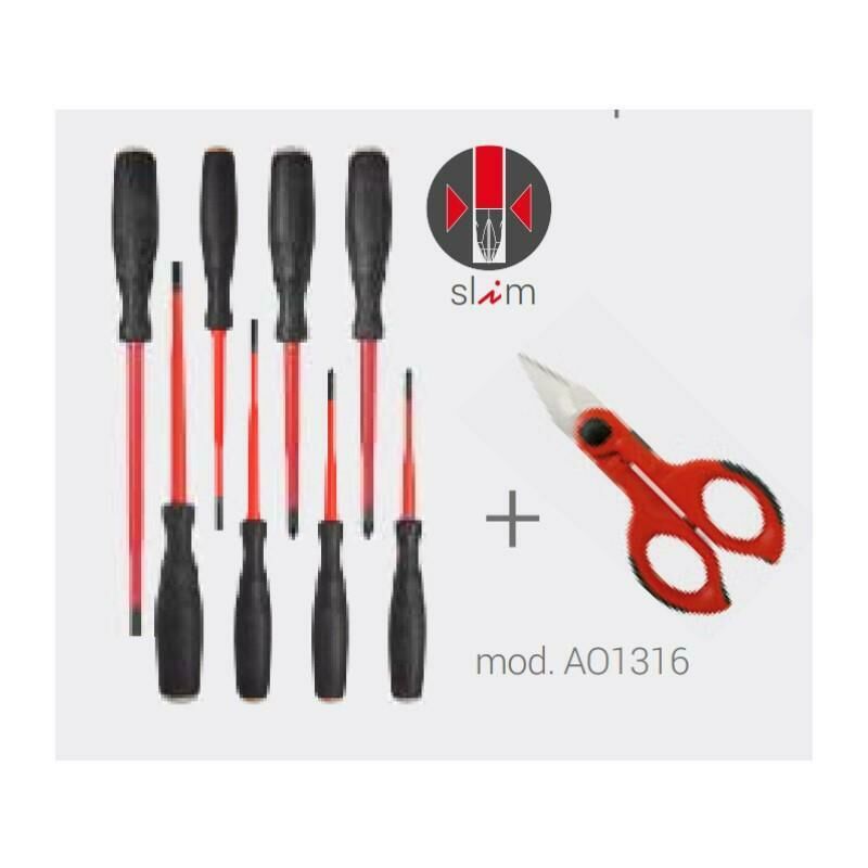 Set 8 giraviti SLIM 4 Giraviti SLIM mm 3,5x100 - 4x100 - 5,5x125 - 6,5x150 4 Giraviti SLIM PH1x75 - PH2x100 - PZ1x75 - PZ2x100 + le forbici F1 con Sefetybox.