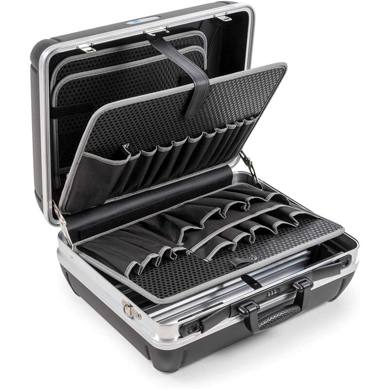 La snella shark è una valigetta portautensili adatta al volo in materiale HDPE, disponibile in due varianti: shark pockets dispone di due tavole per attrezzi estraibili e rispettivamente di 22 tasche portautensili e una tavola per attrezzi per il fondo con altre 15 tasche portautensili. La variante shark MODUL offre una tavola per attrezzi estraibile con 6 portautensili MODUL e altri 3 portautensili MODUL per la copertura del fondo. Gusci della valigetta in materiale HDPE idoneo al volo Robusto telaio in alluminio con protezione dei bordi 2 serrature a leva bloccabili Un lucchetto a combinazione B&W PROFIcode Manico CONVENIENCE B&W Copertura a cerniera Supporto di sicurezza per coperchio L'utensile raffigurato non è contenuto nel volume di consegna