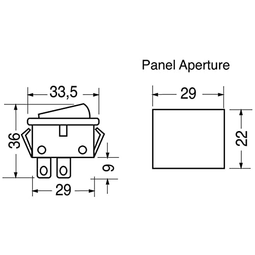 Interruttore bipolare a bilanciere DPST bipolare ON-OFF con tasto luminoso rosso e con terminali faston 6,35mm, foro di montaggio 29x22mm, 250V 16A
