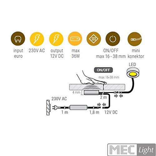 Interruttore a contatto per LED tramite legno fino a 38 mm 12 V + trasformatore 38 W ON/OFF illuminazione touch