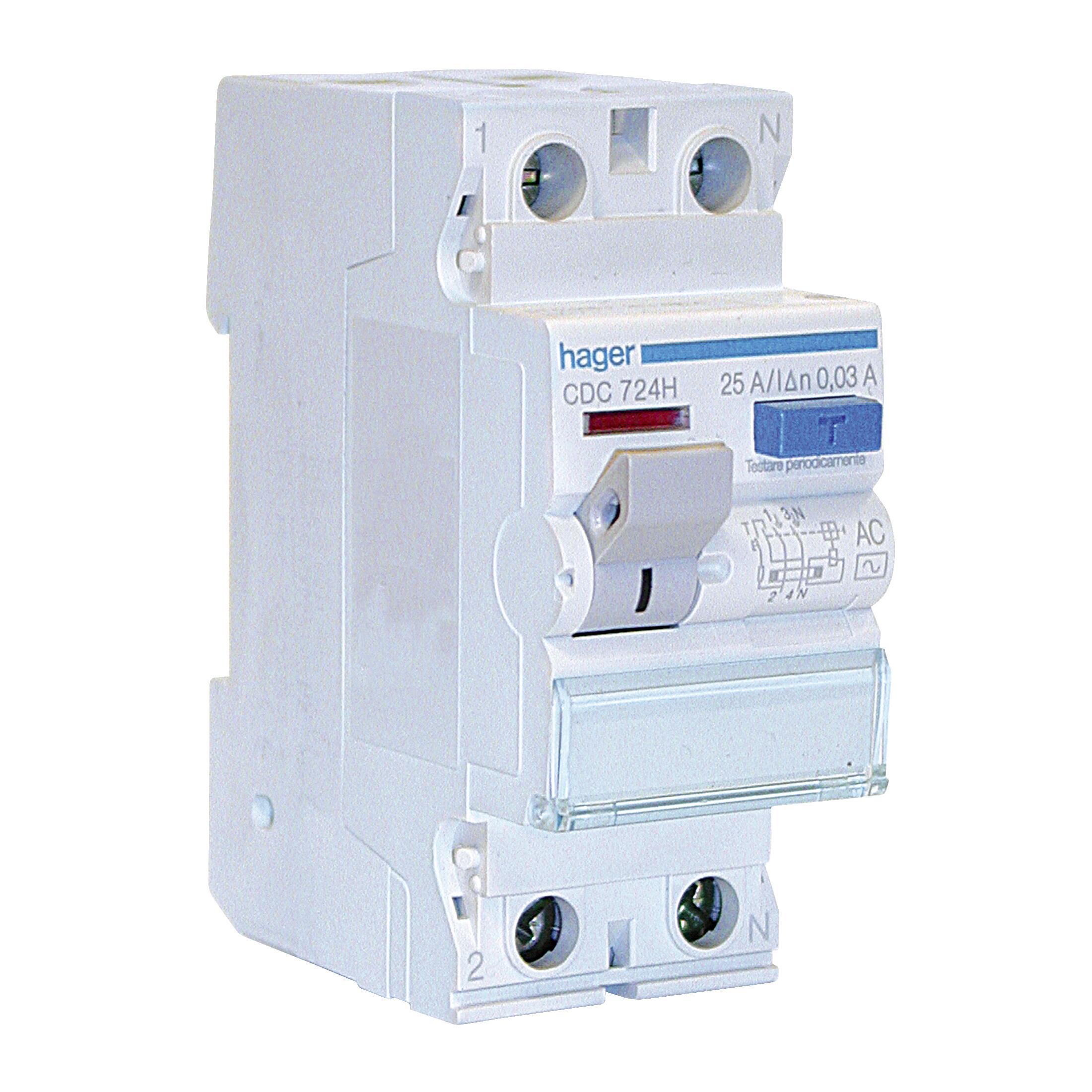 2 moduli, Tipo AC, corrente differenziale Idn 30mA. Vigila sul grado di isolamento dell'impianto elettrico e viene utilizzato a tutela della salute umana in caso di dispersione elettrica o folgorazione. L' intervento è assicurato per correnti alternate sinusoidali differenziali applicate improvvisamente o lentamente crescenti (CEI EN 61008-1)