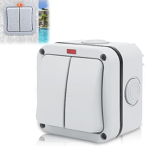 Interruttore Impermeabile IP66 2 vie: HOMURY Interruttore di Controllo Resistente, Doppio Interruttore Impermeabile, Presa di Corrente in Superficie per Giardino Officina Esterno Bagno Balcone(Grigio)