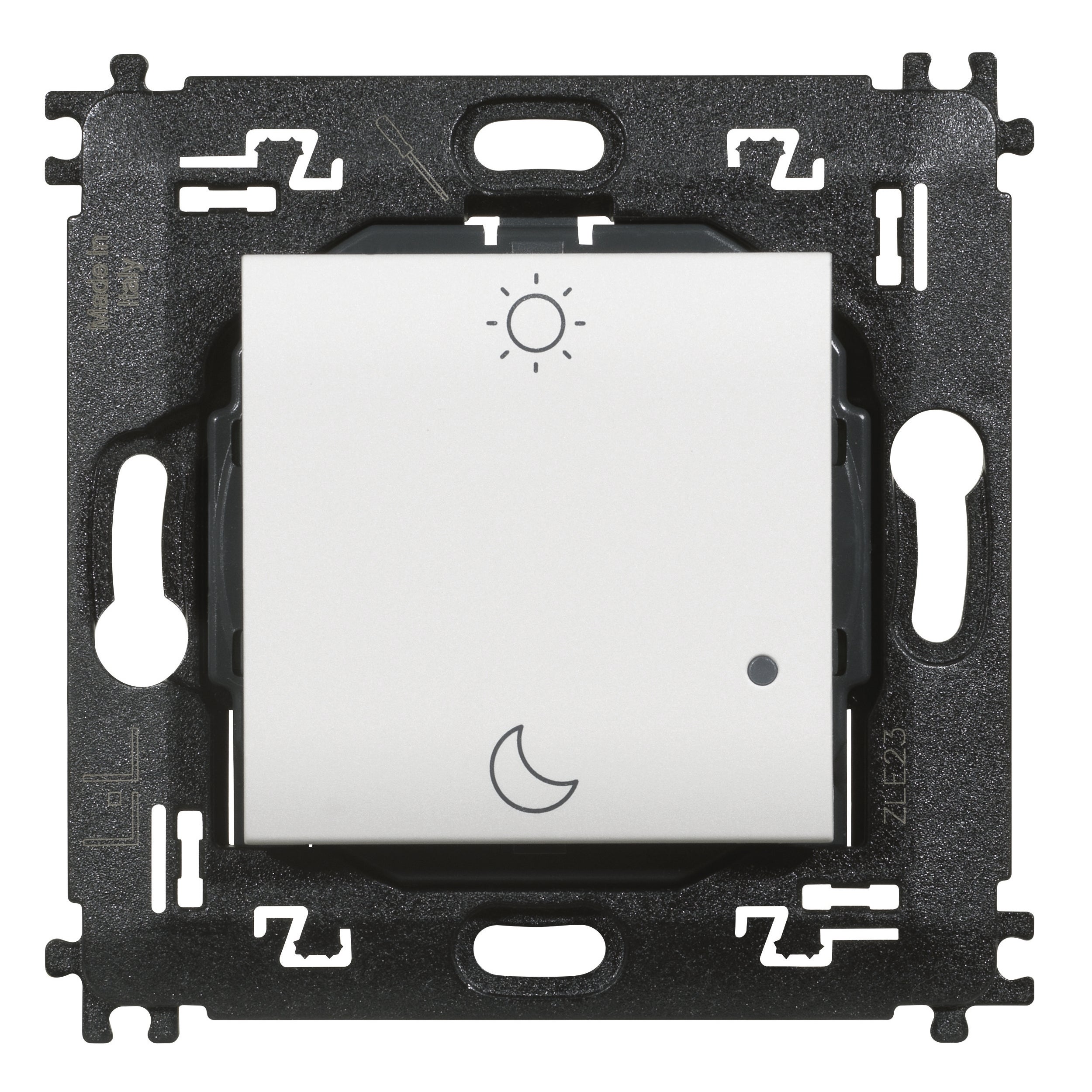 Comando scenario Notte&Giorno wireless.. Alimentazione a batteria 3V tipo CR2032 (fornita a corredo) con autonomia di 8 anni - 2 moduli.. Necessità di attivare e disattivare scenari NOTTE e GIORNO da fuori casa. Dispositivo dotato di 2 pulsanti per l'attivazione degli scenari Notte e Giorno personalizzabili dall'app HOME + CONTROL. Installazione superficiale con adesivi riposizionabili (forniti a corredo) o su scatole da incasso. LED integrato per la segnalazione di batteria scarica. Compatibilità con serie Livinglight. Installazione superficiale con adesivi riposizionabili (forniti a corredo) o su scatole da incasso