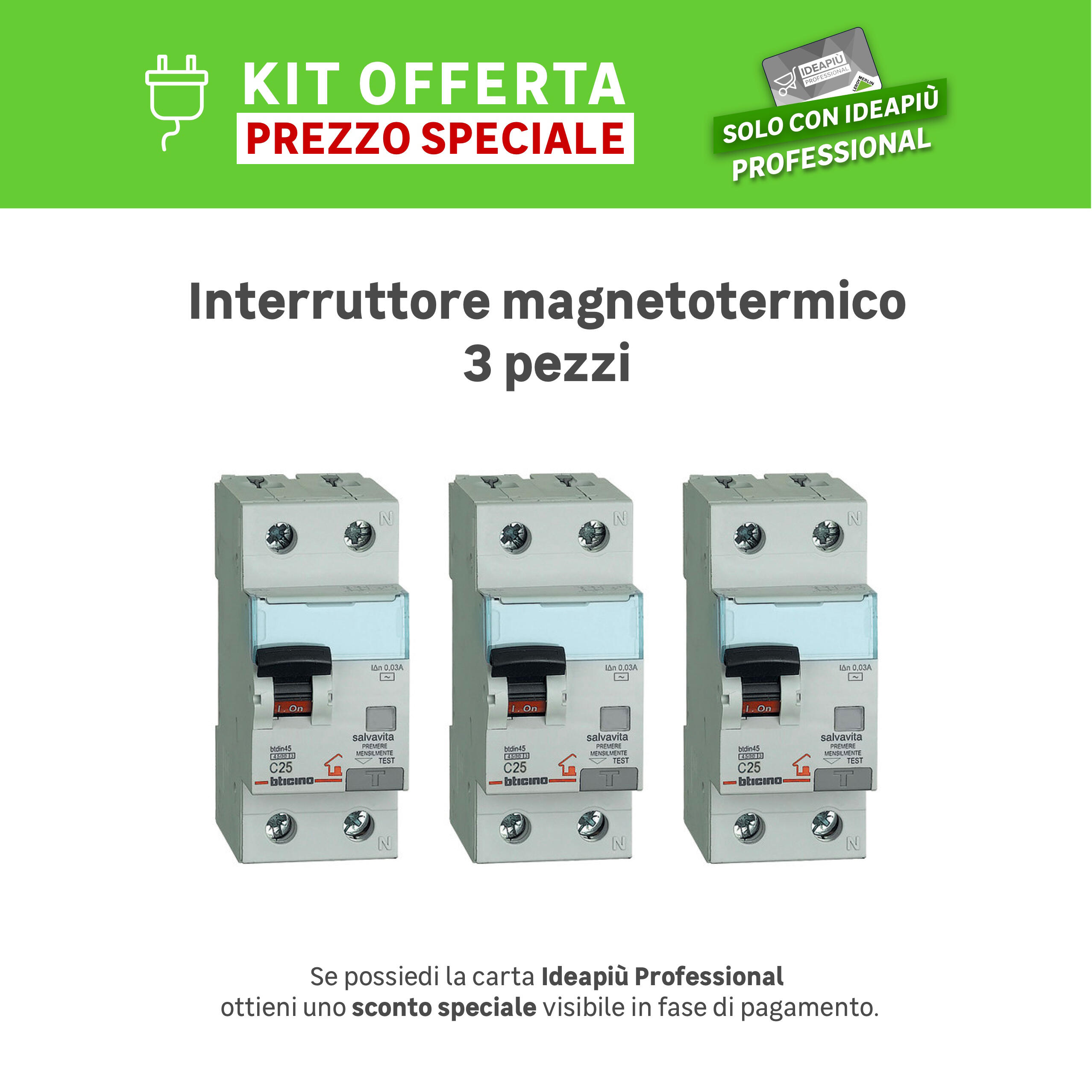 Kit 3 pezzi GC8813AC25. Protegge l'impianto da sovraccarico e sovratensione, oltre ad evitare il rischio di folgorazione in caso di perdita di isolamento. Ideale per allargamento dell'impianto (ad esempio ampliamento dell'abitazione con una nuova stanza) o per impianti molto piccoli e con poche linee (monolocale). Occupa meno spazio all'interno del quadro elettrico rispetto. Convenienza: a parità di prestazioni conviene, a livello economico, un magnetotermico-differenziale piuttosto che un differenziale abbinato ad un magnetotermico