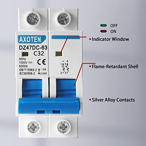 2P Interruttore Magnetotermico,32A Fotovoltaico DC Mini Interruttore 6kA Interruttore di Sicurezza con rilascio di Sovracorrente con Protezione da Sovraccarico e Protezione da Cortocircuito