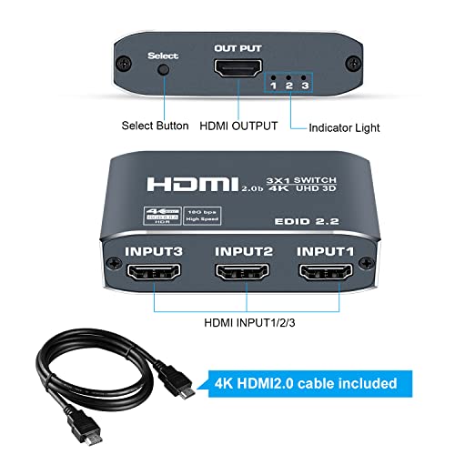 Interruttore HDMI 4K a 60Hz 3 porte, avedio links Alluminio HDMI2.0b Interruttore 3 in 1 Out, 3x1 HDMI Switch Box, supporta HDCP 2.2, 4K HDMI Selector Switcher per console di gioco, Fire Stick