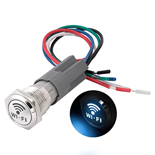 16mm Interruttore a Pulsante Autobloccante in Metallo 12V/24V Interruttore di bloccaggio impermeabile a 5 pin con presa cablata e icona WIFI -Luce blu