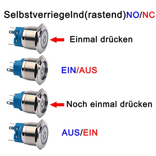 INTERRUTTORE AUTOBLOCCANTE: il pulsante con dimensione del foro di montaggio di 22 mm cambia con una pressione e salta alla posizione originale con un'altra pressione. (come normalmente aperto: premere una volta - acceso, premere ancora - spento/come normalmente chiuso: premere una volta - spento, premere ancora - acceso)