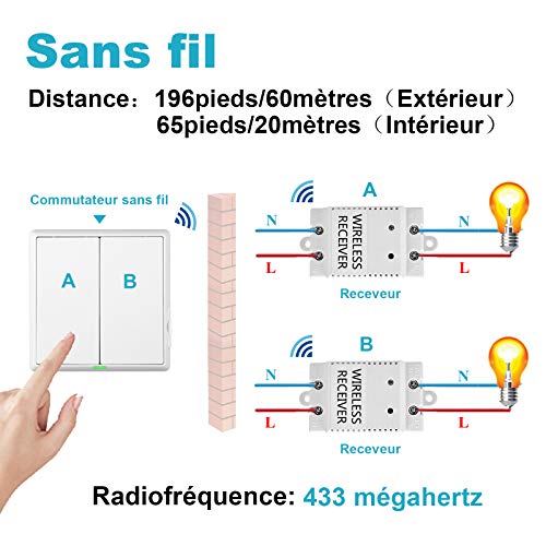 Interruttore della luce a 2 vie, senza fili, con ricevitore, kit interruttore radio, per esterni, 60 m, per interni 20 m, telecomandato, carico massimo 1100 W, RF 433 MHz