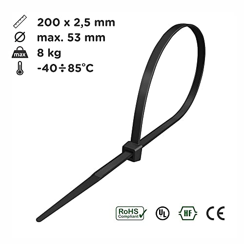 200 pezzi intervisio fascette di cablaggio per cavi 200mm x 2,5mm nero e bianco, tenuta 8 kg, diametro serragio max. 53mm