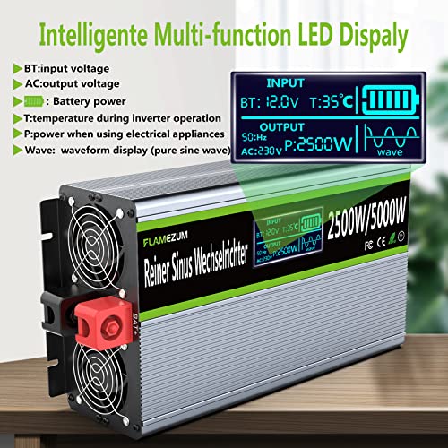 Inverter 12v 220v Onda Pura 2500W/5000W Power Inverter Invertitore di Tensione con Display LCD & Telecomando & 2 Prese CA e 2 Porte USB Per Auto,Camion Camper