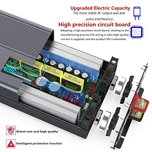 ▶Inverter 12v 220v Onda Pura◀ L'inverter può convertire da 12V CC a 230V CA, fornendo 2500W di potenza continua,5000W di potenza di picco, con display a LED, telecomando, 2 prese CA, 2 porte USB da 3,4 A, porta di uscita ad alta potenza, basta collegare l'inverter alla batteria per alimentare il tuo dispositivo.