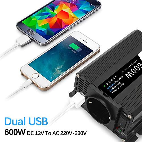 Inverter 12 V a 220 V - 240 V 600 W Cantonape Onda Sinusoidale Modificata, trasformatore da 12 V a 220 V, convertitore con 2 porte USB e 1 presa AC Design in alluminio, con accendisigari per auto