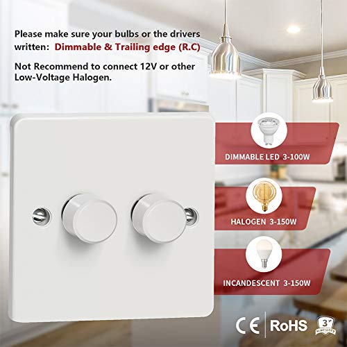 Risparmio energetico: questo interruttore dimmer LED funziona con un massimo di 100 Watt di lampadine LED dimmerabili o 150 Watt di lampadine a incandescenza/alogene, minimo 3 Watt per lampadine a LED. Offri un intervallo di regolazione uniforme da 0 a 100% per ridurre i costi energetici e prolungare la durata della lampadina.