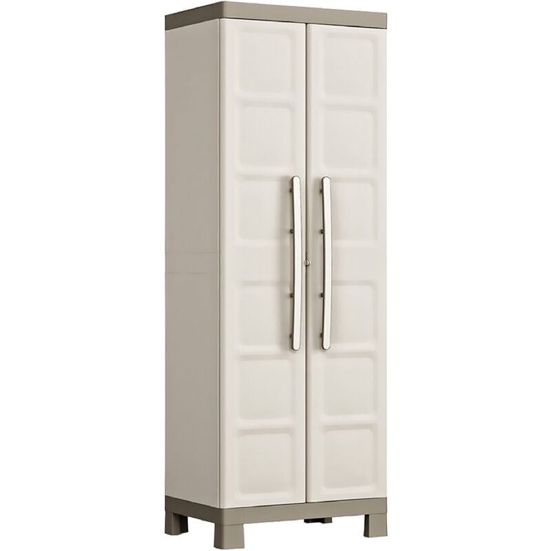 In plastica. Con anta doppia, 4 ripiani, portata 10-15 kg a ripiano. Piedini rialzati, due vaschette da applicare sulle porte e ripiani regolabili in altezza. Lucchettabile, indicato per riporre e conservare secchi, bacinelle, strizzatori, scope elettriche. Prodotto certificato EN14749.