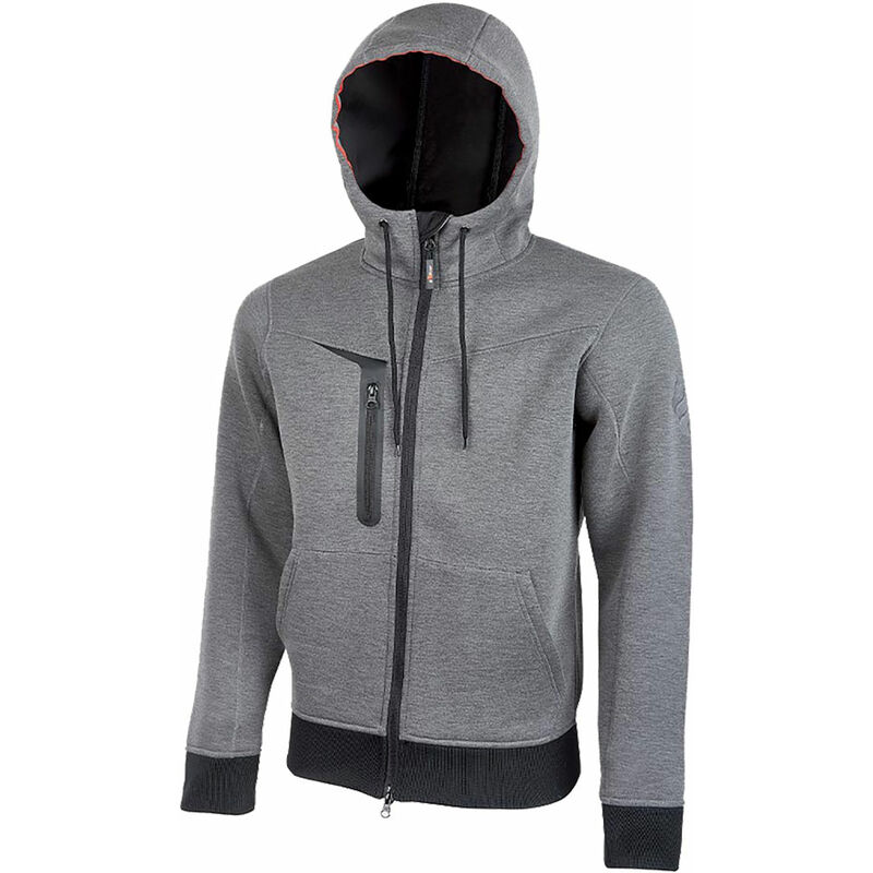 Utilizzo invernale. Chiusura centrale con zip intera doppio cursore. Utilizzo invernale. In tessuto jersey elasticizzato, 5% spandex, 28% rayon, 330 gr/m2. Cappuccio con fettuccia reflex sul bordo. Due tasche frontali, tasca multimediale sul petto lato destro con uscita per auricolare. Polsini e cintura in resistente costina elasticizzata. Fori di aerazione posizionati sotto le ascelle per garantire miglior comfort. A norma EN ISO 13688:2013.