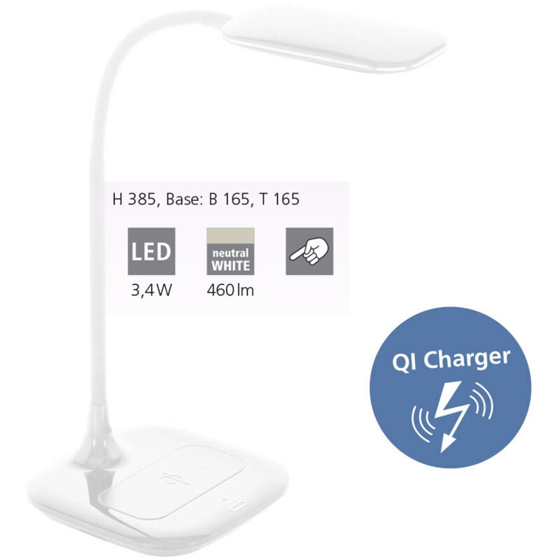 Lampada Da Scrivania Masserie Led Dimmerabile Con Caricabatterie Bianco Eglo La lampada da scrivania MASSERIE del brand EGLO presenta una struttura in policarbonato finitura bianco, caricabatterie wireless e interruttore ON/OFF touch alla base. Caratteristiche Modulo Led da 3,4 watt 470 lumen 4000k luce naturale Dimmerabile Una lampada funzionale, utile non solo per illuminare un specifico punto di interesse ma anche per poter caricare tramite funzione wireless i vostri dispositivi. Un elemento dal design semplice e moderno perfetta per essere posizionata su tavoli e scrivanie dei più grandi e dei più piccoli.