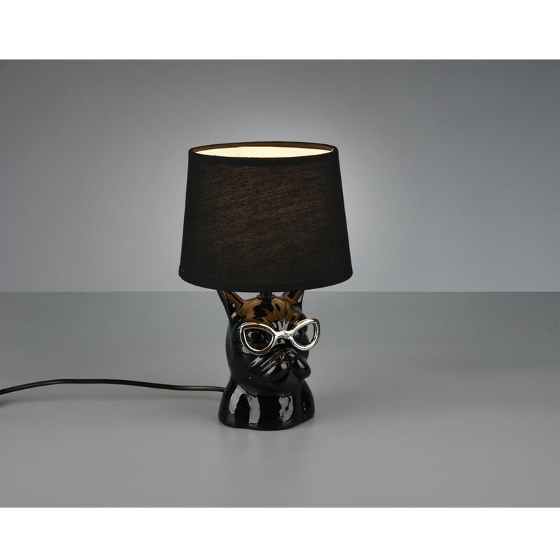 La lampada da tavolo DOSY di Trio Lighting presenta una base in ceramica finitura nera a forma di bulldog con occhiali e paralume in tessuto nero, interruttore a filo incluso. Dotata di attacco per lampadina E14 max 40 watt (acquistabile separatamente). Un elemento stravagante ed originale, perfetto sia per illuminare sia come complemento d'arredo per diversi ambienti della vostra casa arredata in stile moderno, ideale ad esempio per la zona living o la camera da letto. Disponibile anche nelle varianti di finitura bianca, grigia, rosa e verde.