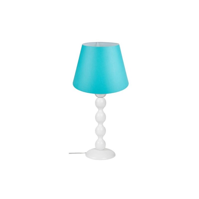 Lampada da tavolo LAGUNAH372877 Caratteristiche: Base in legno bianca. Paralume tessuto turchese. Misure paralume L 30 X H 22 cm. Misure base L 17 X H 37 cm. Attacco lampadina 1 x E27 60w. ASZ0550+MDL2877.