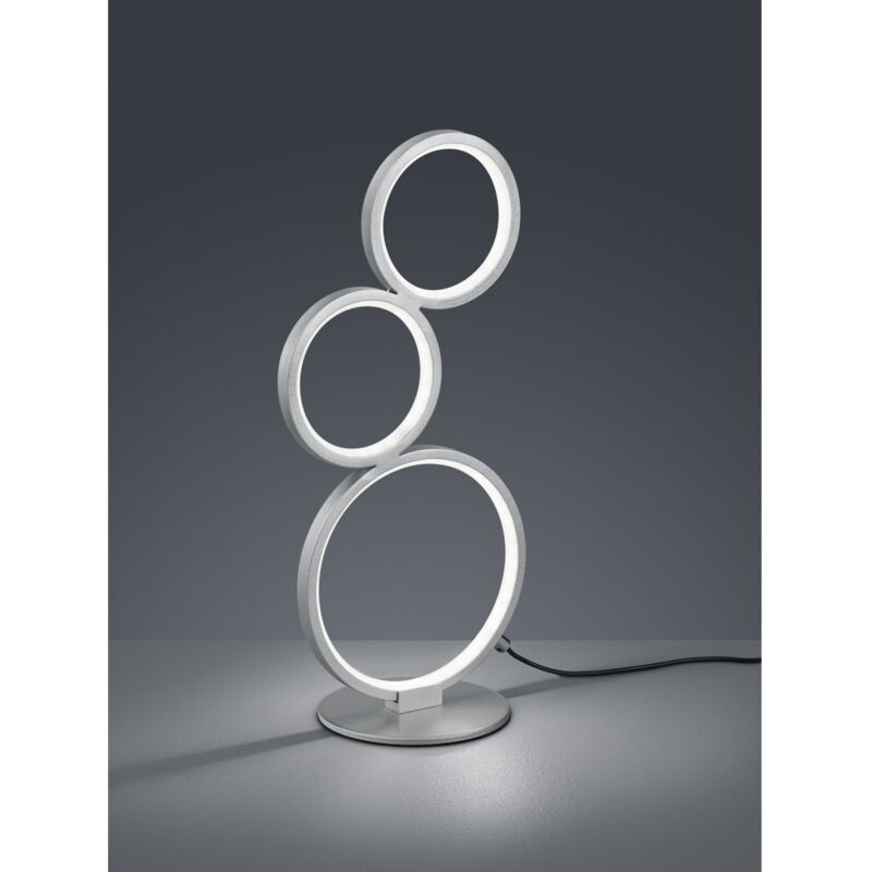 La lampada da tavolo della serie RONDO di Trio Lighting presenta una montatura in metallo argentato con 3 diffusori a forma di anelli di diverse dimensioni, interruttore su cavo incluso. Sorgente luminosa a LED integrato da 17 watt, resa luminosa 1900 lumen, temperatura colore 3000K, luce calda. Grazie al dimmer integrato é possibile regolare l'intensità a diversi livelli. Non compatibile con dimmer esterno. Un elemento dal design originale che non passa inosservato, una struttura particolare, ideale per illuminare e al contempo arredare con originalità ambienti in stile moderno residenziali e non. Un lumetto da collocare sopra tavolini o comodini di un salotto, una zona living o una camera da letto. Disponibile anche la variante di finitura nero e bianco opaco.