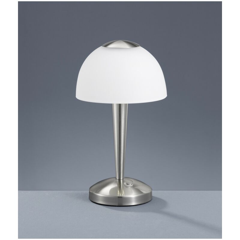 La lampada da tavolo VENTURA di Trio Lighting presenta una struttura cilindrica in metallo finitura nichel opaco e diffusore a fungo in vetro satinato bianco, sensore touch integrato alla base. Disponibili anche la variante di finitura ottone. Sorgente luminosa a LED SMD da 4 watt, 350 lumen, 3000k (luce calda). Grazie al sensore touch questa lampada può essere accesa a 3 diversi livelli di luminosità. Una lampada da tavolo semplice e versatile, perfetta sia per illuminare sia come complemento d'arredo per la vostra casa in stile moderno, da collocare ad esempio nella zona living, nella sala da pranzo o nella camera da letto.