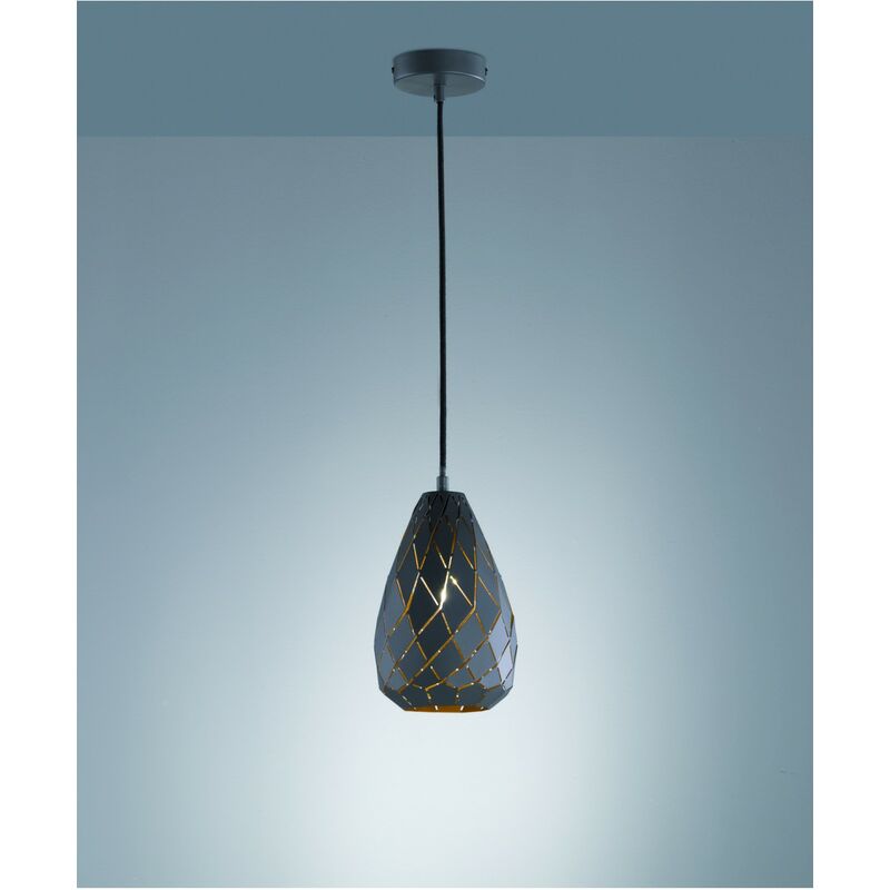 Sospensione Singola Antracite con Tagli Laser La piccola sospensione ONYX di Trio Lighting è composta da struttura in metallo di colore antracite e paralume in tinta con la struttura decorato da tagli laser romboidali, interno oro. Cavetto regolabile in lunghezza che consente di variare l'altezza del lampadario in base alle proprie esigenze. È possibile installare un alloggio per lampadina con attacco E27 max 42 watt (acquistabile separatamente). Per una migliore resa luminosa e al contempo un basso consumo si consiglia l'utilizzo di lampadine a filamento Led. Una lampada a sospensione dal design moderno, facile da installare a soffitto senza particolari accorgimenti. Consigliata per essere installata singolarmente o anche in sequenza per illuminare in maniera diretta piani sottostanti, come ad esempio il tavolo o la penisola della cucina o della sala da pranzo. Disponibile anche il lampadario rotondo a 3 luci e quello in linea a 4 luci. Caratteristiche: Struttura in metallo di colore