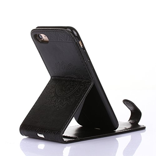 IPhone 7 Custodia, iPhone 7 Cover, Custodia Apple iPhone 7 in Pelle Portafoglio, JAWSEU [Shock-Absorption] Lusso Goffratura fiore PU Leather Wallet Flip Cover Custodia for iPhone 7 Copertura Protectiva Bumper con Super Sottile Morbido Silicone interno Case e Porta Carte di Credito Custodia iPhone7 Case Portafoglio Custodia Pelle Magnetica Cordino Supporto Custodia Cover per Apple iPhone 7 4.7, iPhone 7 Custodia - Nero