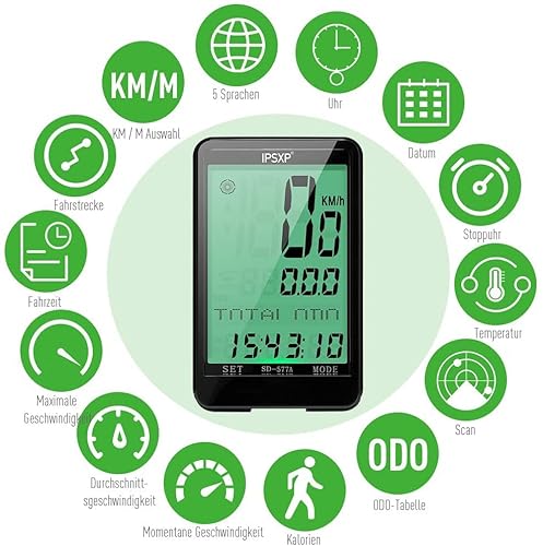 【Ampio schermo retroilluminato e 5 impostazioni della lingua】contachilometri bici è dotato di un ampio display a LED retroilluminato, in modo da poter leggere tutti i dati in modo semplice e chiaro, anche quando lo si utilizza di notte o in altri luoghi scarsamente illuminati. Inoltre, questo ciclocomputer può cambiare 5 lingue.