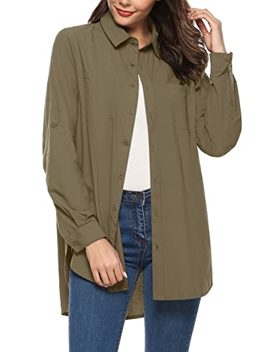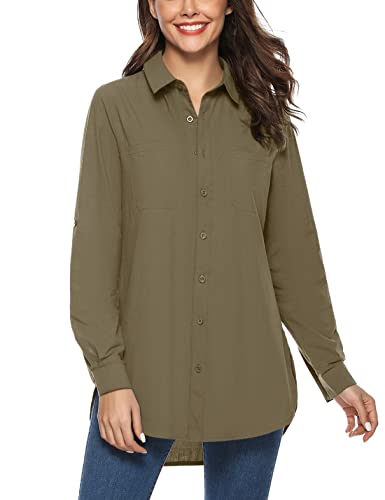 Irevial Camicia Donna Cotone Lungo Blusa a Manica Lunga Casual Camicetta Shirts Army Green M