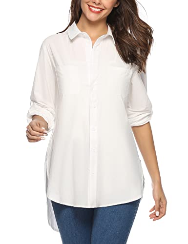 Irevial Camicia Donna Cotone Lungo Elegante Bluse a Maniche Lunghe Casual Camicia Vestito Shirt Top Bianco M