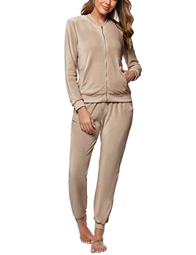 Irevial Completo Sportivo Donna Velluto Tuta Ginnastica Due Pezzi Pigiama Casual Giacca Cerniera e Pantaloni Casa Jogging Cammello S