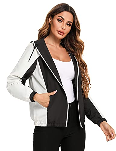 Irevial Giacca Impermeabile Donna, Antipioggia Giacca a Vento da Donna, Giacca con Cappuccio con Zip Donna, Cappotto Donna Leggera con Tasche per Escursioni, Viaggi, Nero+Bianco, M