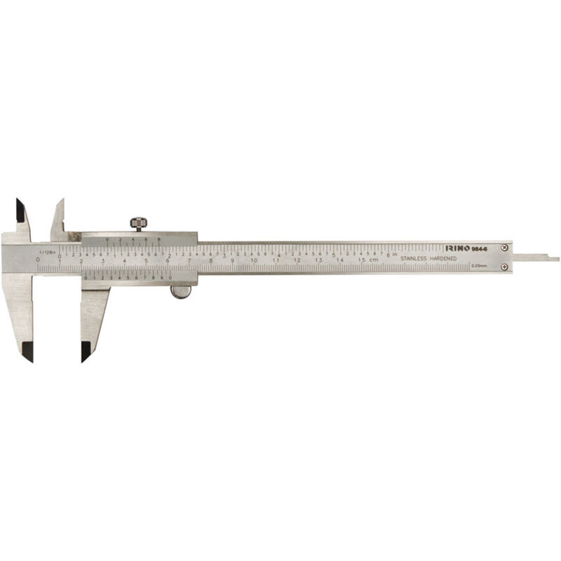 Calibro 984-6-1 irimo. calibro a corsoio. precisione ±0,03 mm/m. in acciaio inox temprato. include tavola filettata. fornito in scatola di plastica per una conservazione sicura.