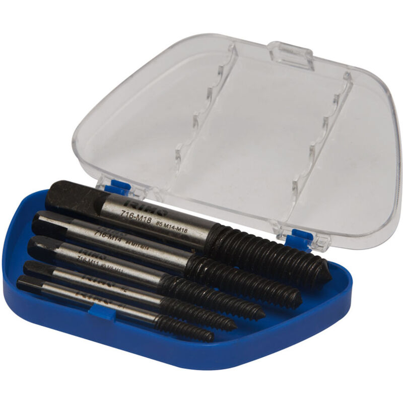 Set di 5 estrattori di prigionieri (1420 1421 1422 1423 1424) 716-5-1 irimo. per rimuovere viti, prigionieri e tubi rotti. da m3-6 a m14-18. finitura: cromato.
