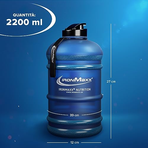 Cos'è incluso: IronMaxx Water Gallon - Bottiglia da Fitness Blu Satinata per Acqua - A Prova di Perdite - Plastica senza BPA - Capacità di 2200 ml - Maniglia Ergonomica - Tappo Collegato con Nastro